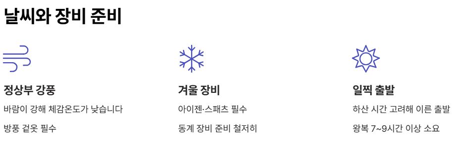 • 정상부는 바람이 강해 체감온도 낮음