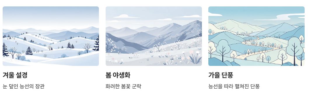 특히 겨울 설경과 봄·가을 능선 풍경으로 유명해 사계절 등산객이 꾸준히 찾는 산입니다.
