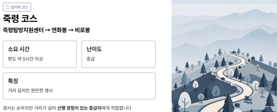 • 특징 : 계곡·숲길·능선 조합